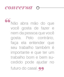 Por isso, não abra mão do que você gosta de fazer e nem da pessoa que você gosta. Pelo contrário, faça ela entender que seu trabalho também é importante e que ter um trabalho bom e bem sucedido pode ajudar no futuro do casal.