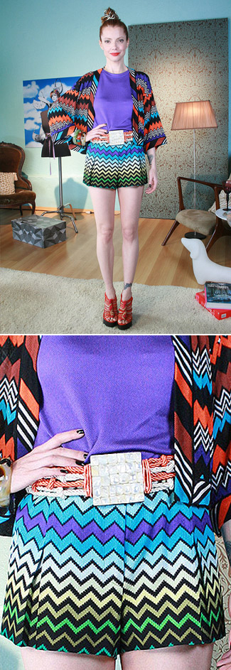 Short, blusa e casaco de tricô Missoni; sapato Studio TMLS; cinto Opto Design; e pulseiras Silvia Furmanovich