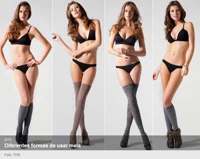 Esta tendência encurta a silhueta; por isso, Juliana indica usá-la com minissaia ou vestido bem curtinho para promover um equilíbrio. A consultora de moda Dani Romani completa: “Para parecer mais alta e com pernas mais finas, invista em meia e sapatos da mesma cor. O monocromático disfarça pernas grossas e ajuda a alongar”. E se a intenção for disfarçar tornozelos finos demais? “Uma opção é trocar o comprimento soquete pelo longuete”, indica Juliana. Dani ainda dá a dica: “Tente usar uma meia com mais volume e uma saia mais curta também volumosa; rodada ou plissada, que dê o formato de A”.