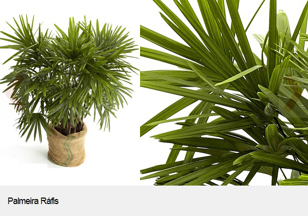 Com múltiplos caules semelhantes ao bambu, a Ráfis cresce ereta como suas folhas plissadas próximas. É muito usada sozinha em vasos para escritórios ou para montar jardins de inspiração oriental. Fica bem em todo tipo de iluminação. É importante regá-la com frequência sem encharcar seu substrato.