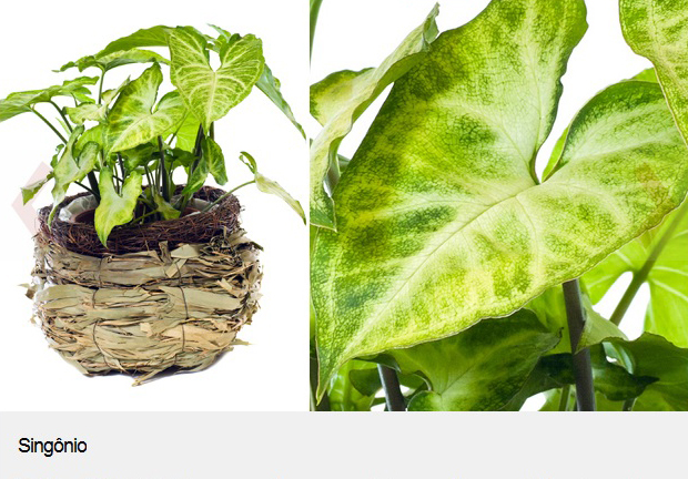 As folhas do Singônio têm nervuras brancas quando jovens e ficam completamente verdes depois da madura. Devido ao seu formato, é muito usado para decoração em vasos ou como forragem em jardins e arranjos. Ele deve ser cultivado à meia sombra e regado com frequência para manter a terra úmida.